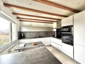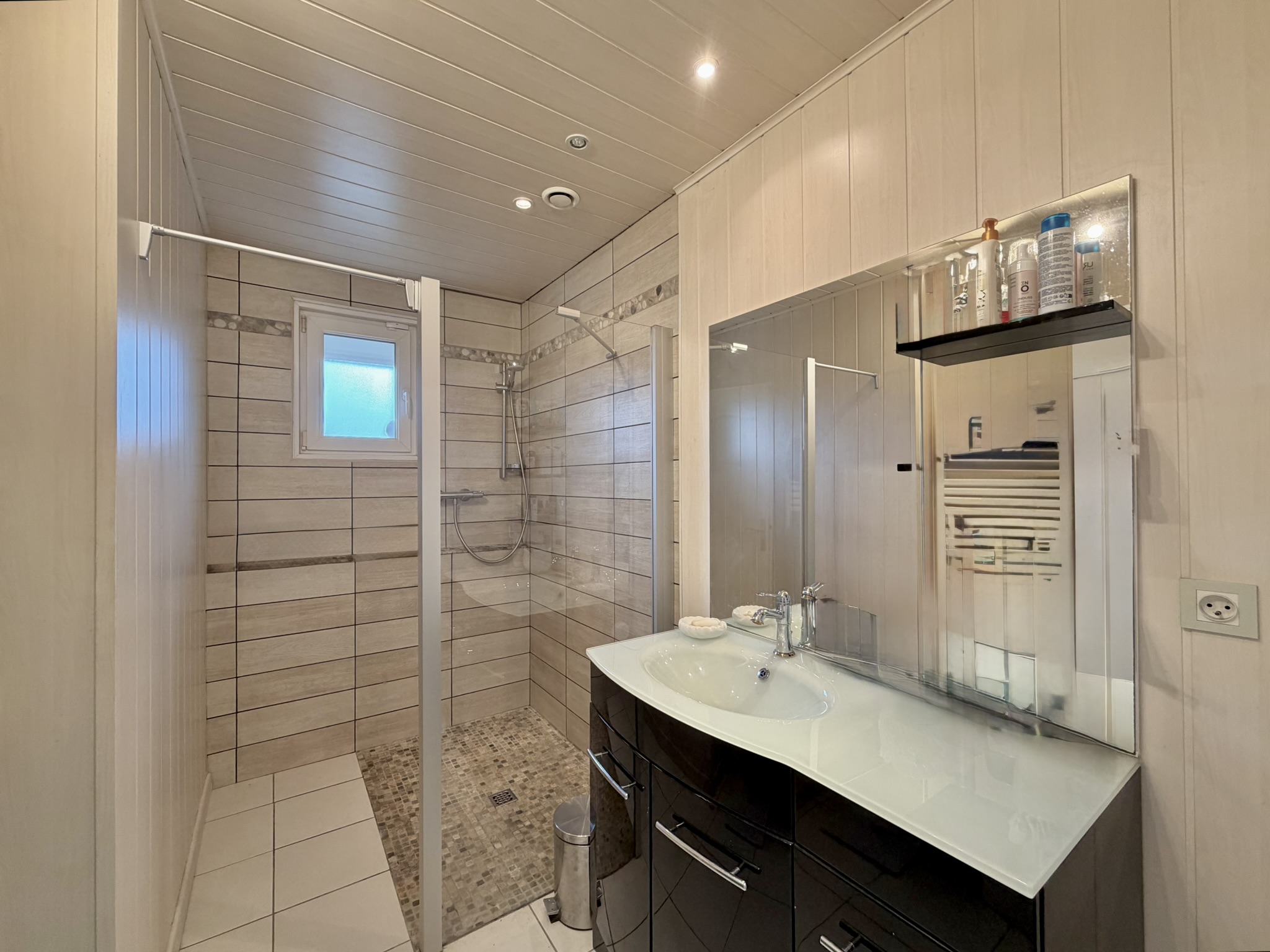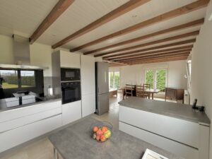 - au rez-de-chaussée : belle cuisine équipée ouverte sur salon séjour ayant un accès direct à la terrasse, trois grandes chambres, WC, belle salle d’eau avec grande douche à l’italienne, une pièce restant à aménager avec arrivée d’eau et évacuation (idéal future buanderie)